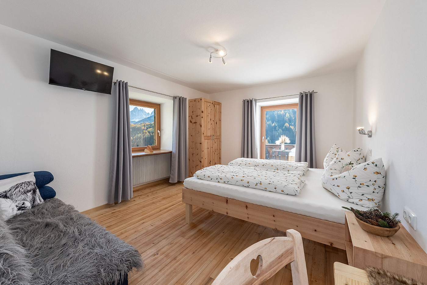 Willkommen in Ihrem Urlaubszuhause auf unserem Bauernhof im Villnösstal – ruhig gelegen, sonnig und mit freiem Blick auf die imposanten Geislerspitzen. Unsere neu renovierten Zimmer und Ferienwohnungen verbinden traditionelles Ambiente mit modernem Komfort. Genießen Sie wohltuendes Zirbenholz, natürliche Holzböden und den einzigartigen Ausblick in unseren Unterkünften – direkt vom Bett oder vom Balkon aus.